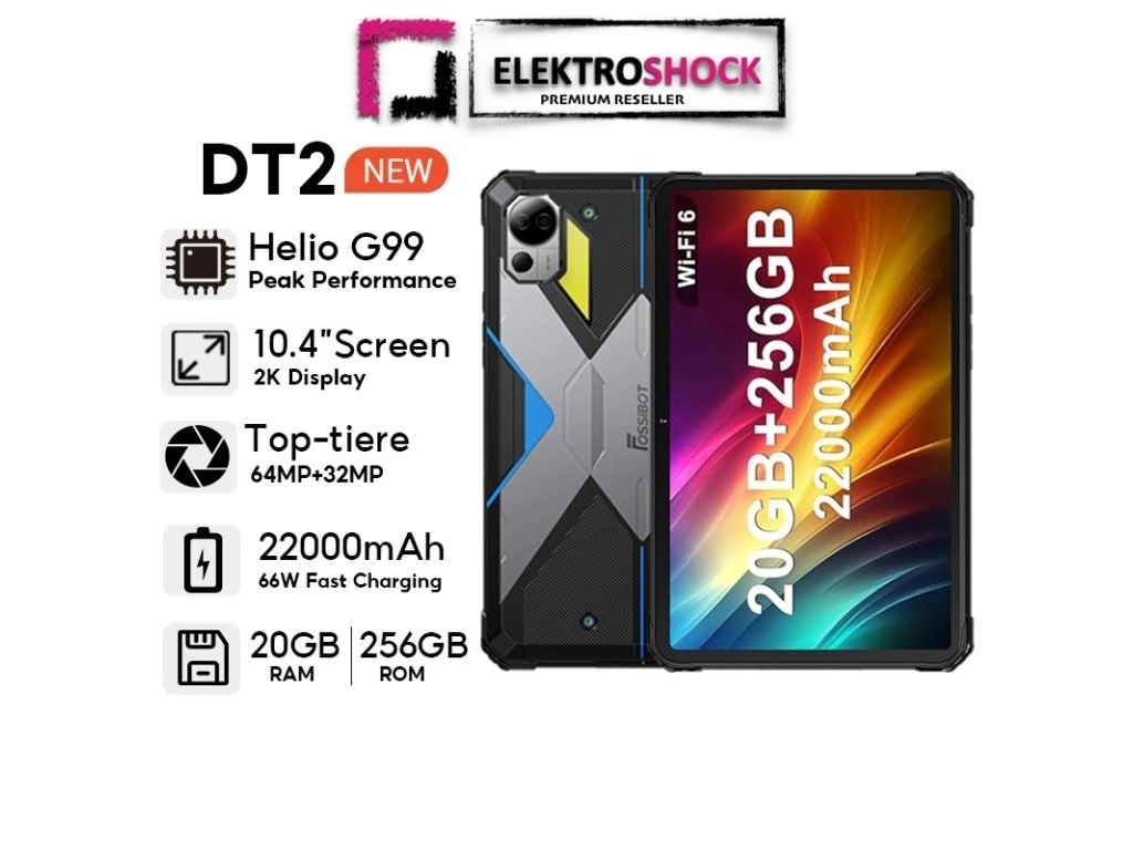 A FOSSiBOT DT2 nyolcmagos Helio G99 processzorral és G57MC2 GPU-val van felszerelve, amely kiváló teljesítményt nyújt mind a mainstream, mind az igényesebb alkalmazásokhoz. A táblagép 12 GB RAM-mal és 256 GB belső memóriával rendelkezik, amely T-flash kártyával akár 2 TB-ig bővíthető. Ezáltal a készülék ideális a többfeladatos munkavégzéshez és nagy mennyiségű adat tárolásához.